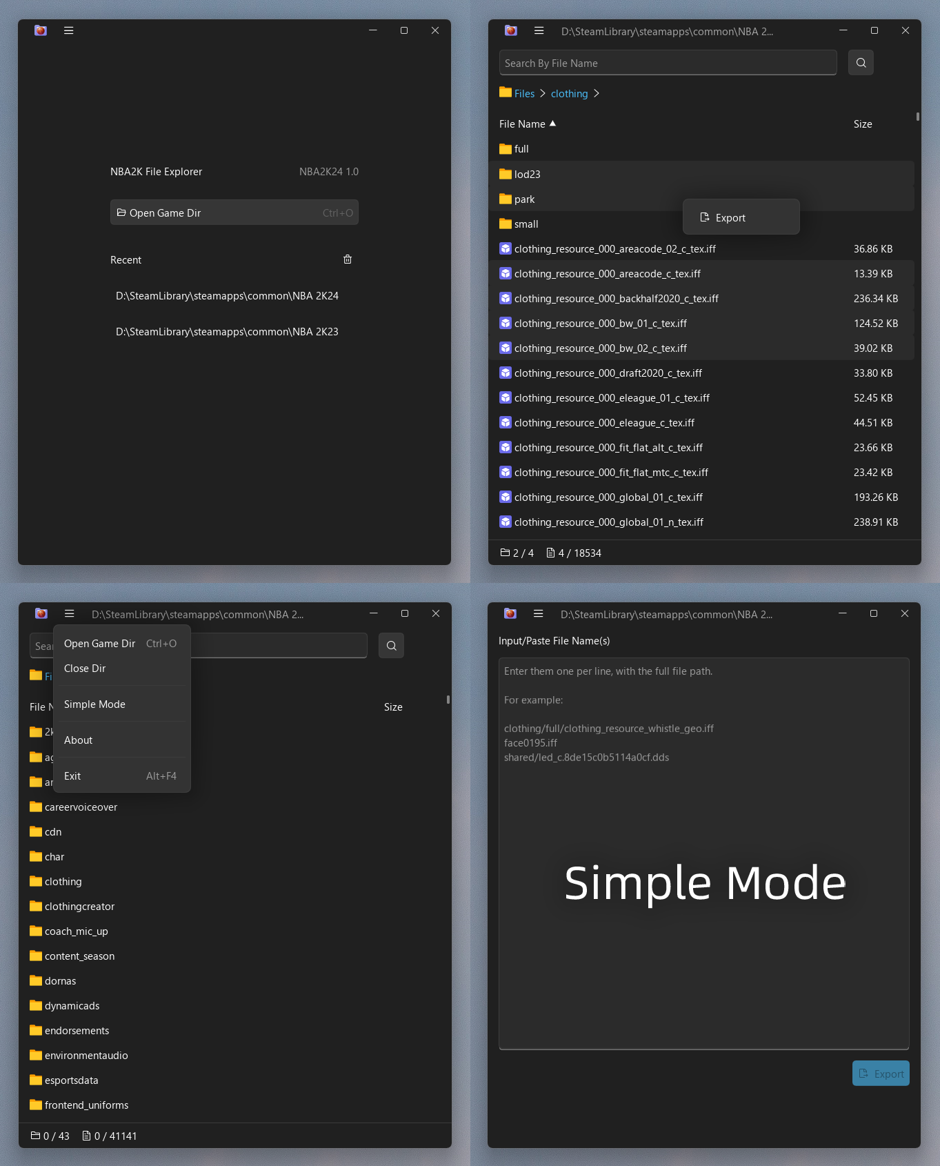 Since 2k may remove the manifest file in subsequent updates (which is the only file that provides a complete list of file names), if the manifest is missing, you can manually input/paste file names in the Simple Mode for file exporting (similar to the file export feature in NBA2K_Hook Built-in GUI).